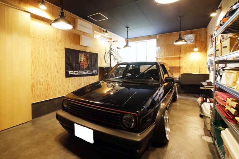 男のロマンが詰まったワイルドなガレージはご主人様のこだわり。インテリアもご主人様のセレクトで愛車のメンテナンスもはかどりそう。