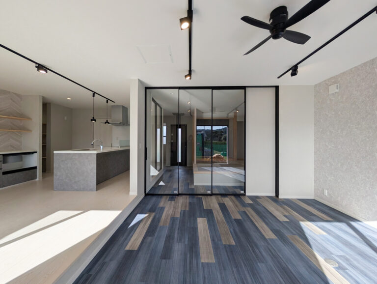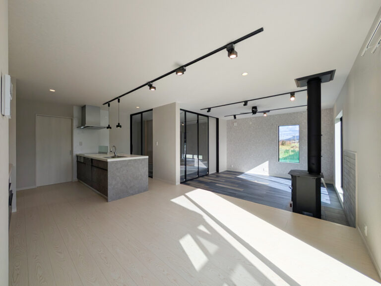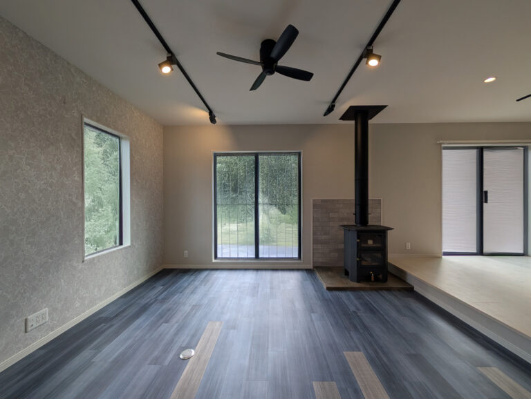 リビングの床は、土間の上にフロアタイルを張って仕上げました。