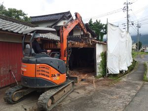 納屋はリノベーションではなく、解体ですので油圧ショベルを使い早く進みますが、母屋はリノベーションですので、柱など傷を付けないよう、人の手で解体していきます。